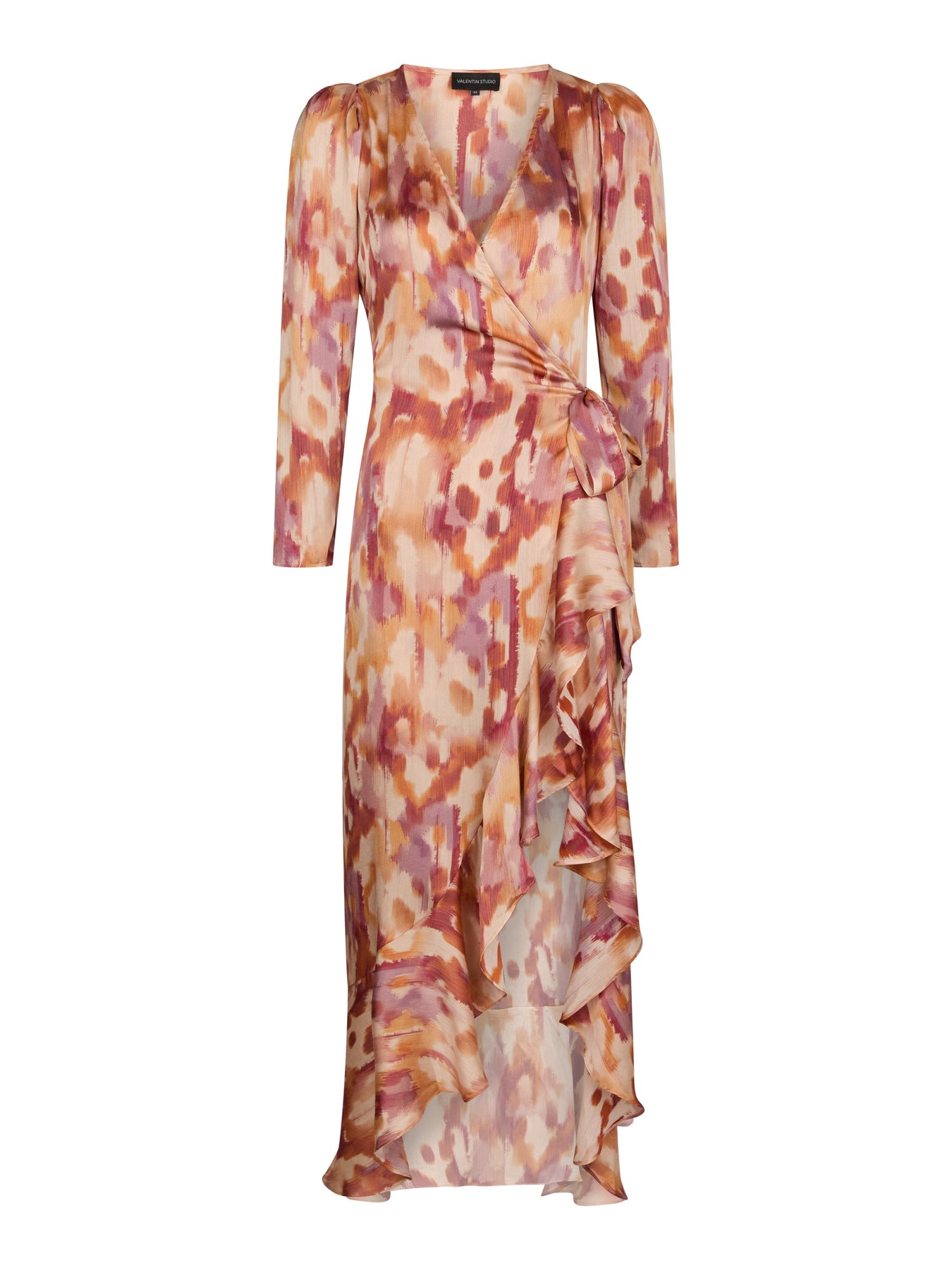 Mekko Valentin Studiolta, valmistettu 100 % polyesteristä poltetun oranssin sävyssä. Tässä mekossa on utuinen kuvio punaisen, oranssin ja violetin sävyissä.
