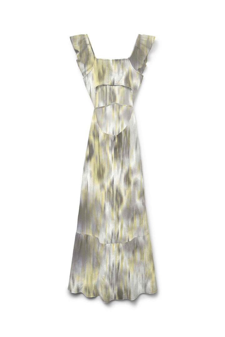 Vero Modan paitamekko kukkakuosilla keltaisena, vaaleanpunaisena ja sinisenä. Mekossa on V-pääntie, lyhyet puffihihat ja nappikiinnitys edessä, jossa on vyötäröllä sidottava nauha.