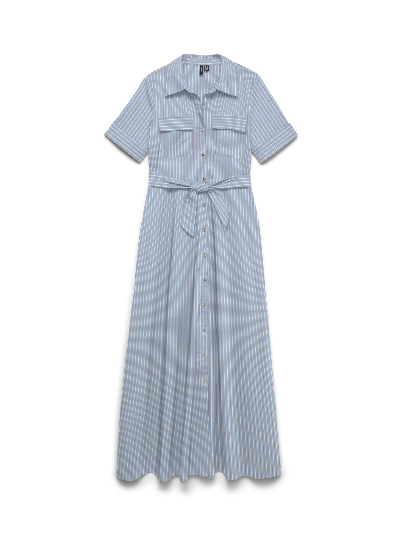 Vaaleansininen paitamekko Vero Modalta, jossa on vaaleansiniset raidat. Mekossa on paitakaulus, nappikiinnitys edessä ja vyötäröllä solmittava vyö.