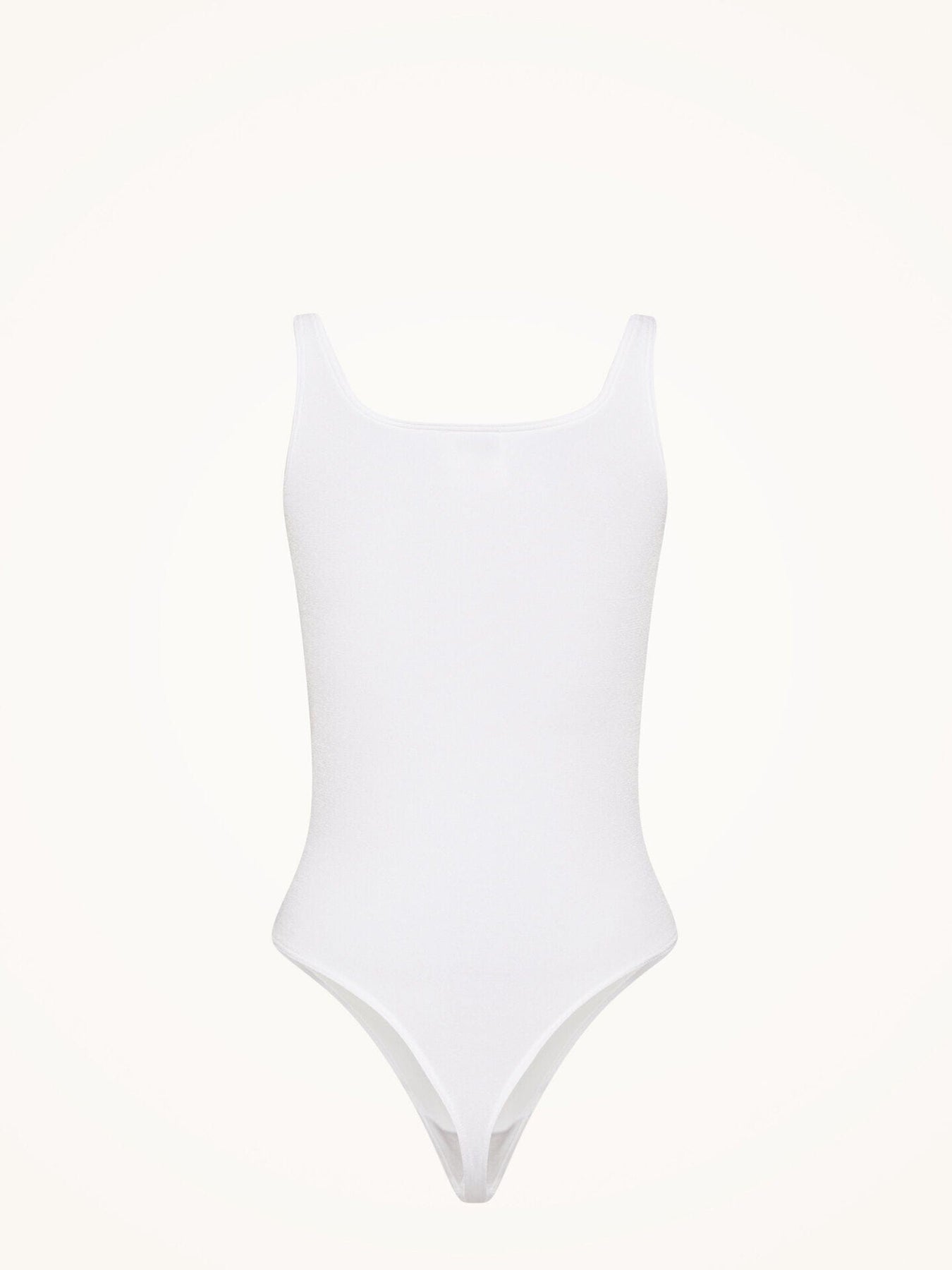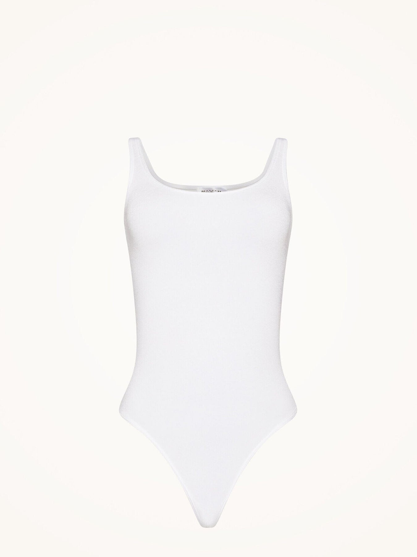 Wolfordin valkoinen string body, jossa on pyöreä pääntie. Tiukka istuvuus ja string-yksityiskohta antavat sileän siluetin vaatteiden alla.