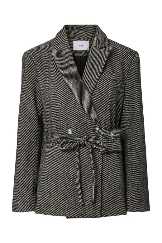 Musta bleiseri Y.A.S:ltä, jossa on kalanruotokuvio. Bleiserissä on kaksirivinen nappikiinnitys neljällä napilla ja vyö vyötäröllä. V-pääntie ja pitkät hihat antavat bleiserille klassisen leikkauksen.