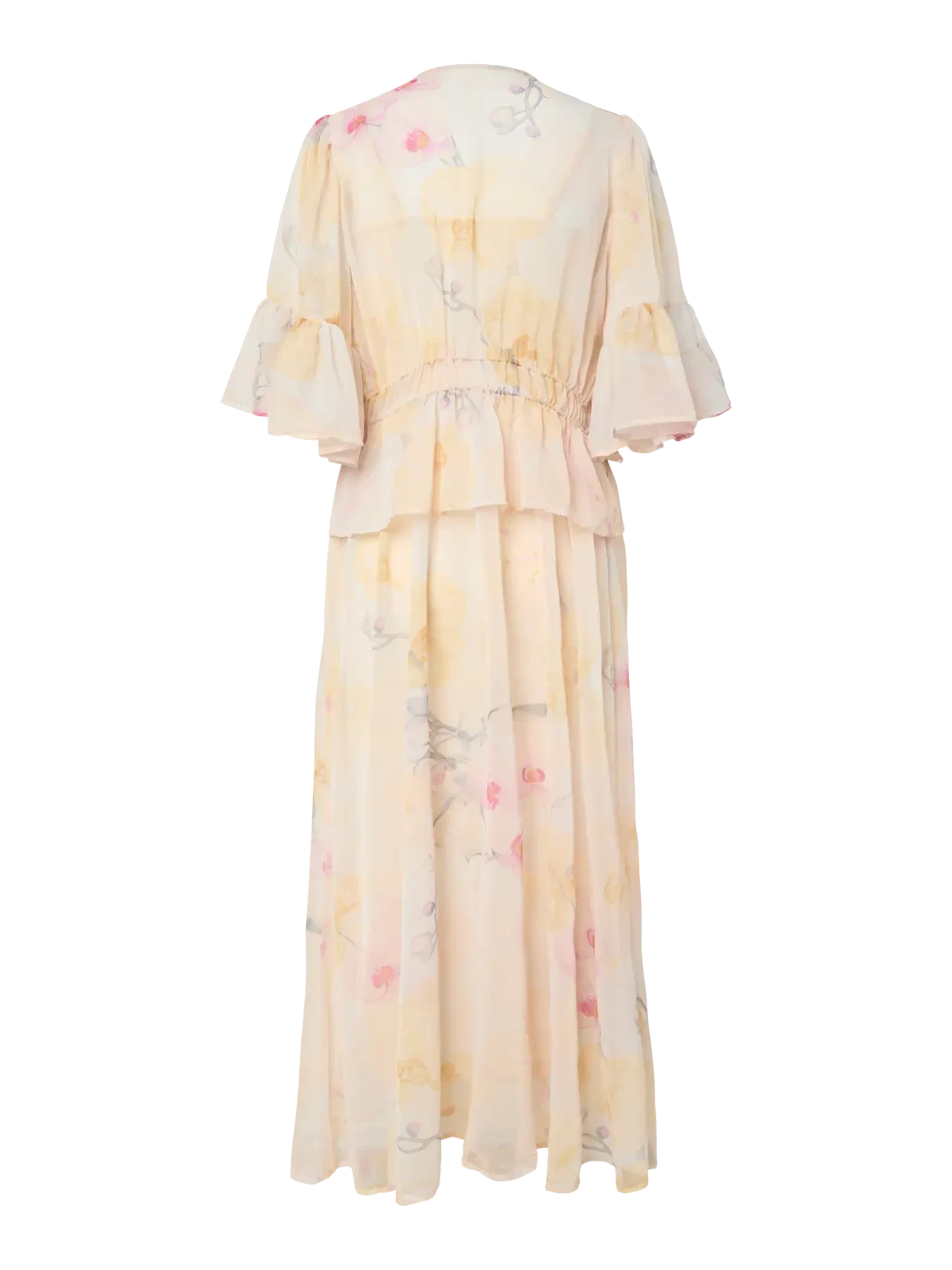 Nilkkapituinen mekko YASilta, 100 % kierrätetystä polyesteristä. Mekossa on kukkakuvio vaalealla pohjalla kermaisissa ja valkoisissa sävyissä.