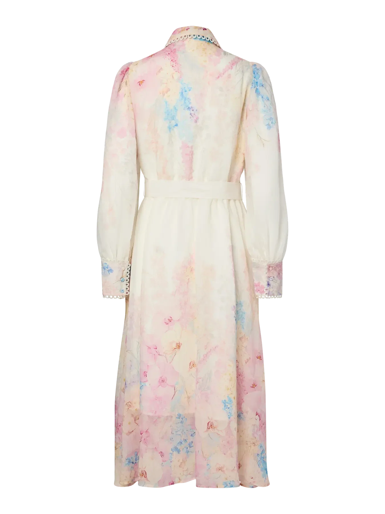 Pitkä mekko YASilta, jossa on kukkaprintti pastellisävyissä vaaleanpunaisena ja sinisenä kermanvalkoisella pohjalla. Mekossa on pitkät hihat ja vyö vyötäröllä.