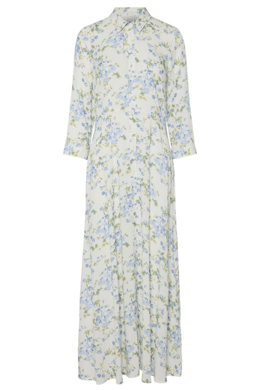 Pitkä paitamekko Y. A.S:ltä kukkakuosilla sinisen ja valkoisen sävyissä. Mekossa on nappilukitus koko matkalta, V-pääntie ja kolmanneksen pituiset hihat.
