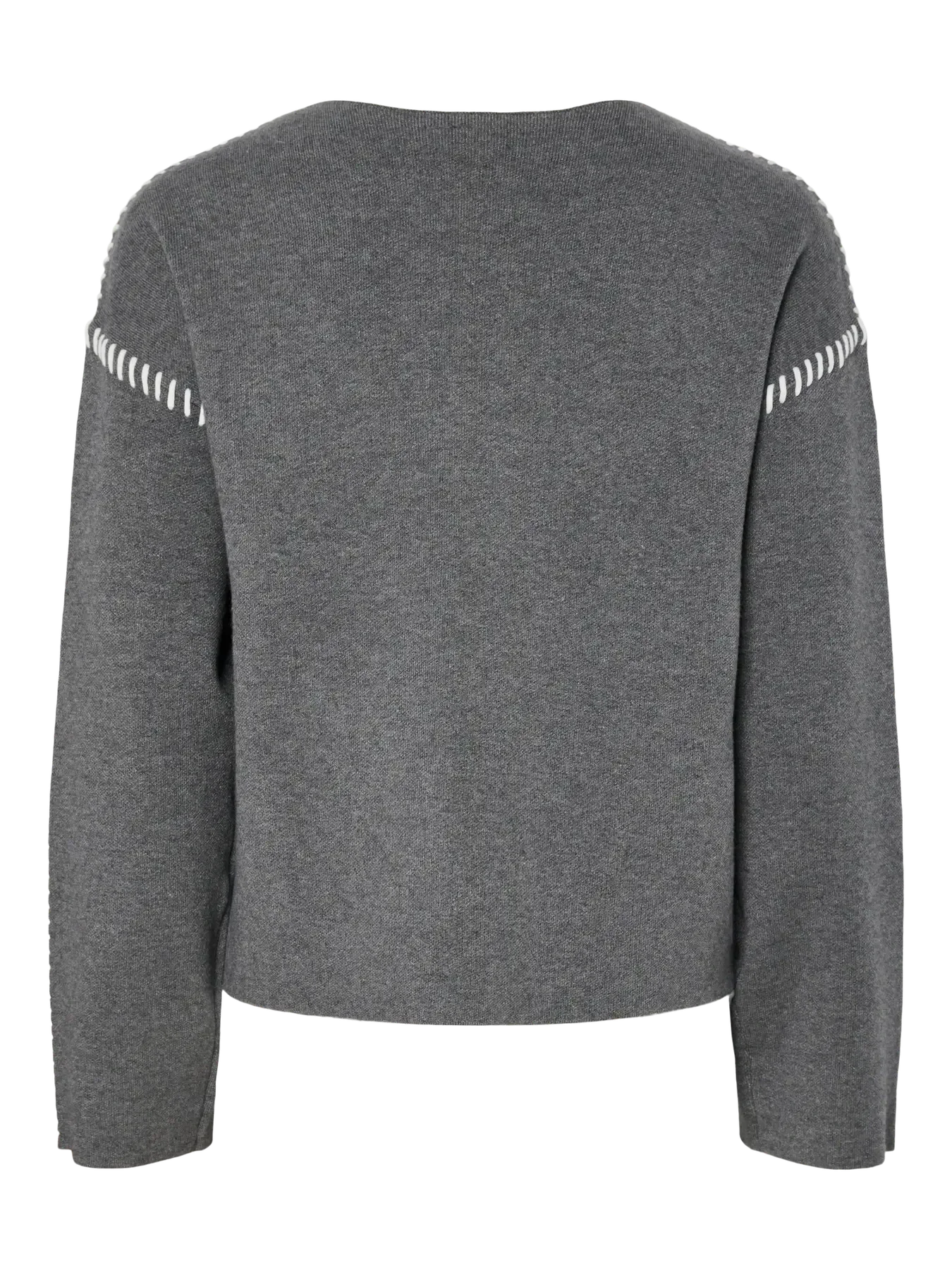 Harmaa neulepaita Y. A.S:ltä pyöreällä kaula-aukolla ja oversized-mallisella. Neulepaidassa on koristeellisia saumoja olkapäiden ja hihojen varrella, mikä luo kontrastia meleratulle harmaalle värille.