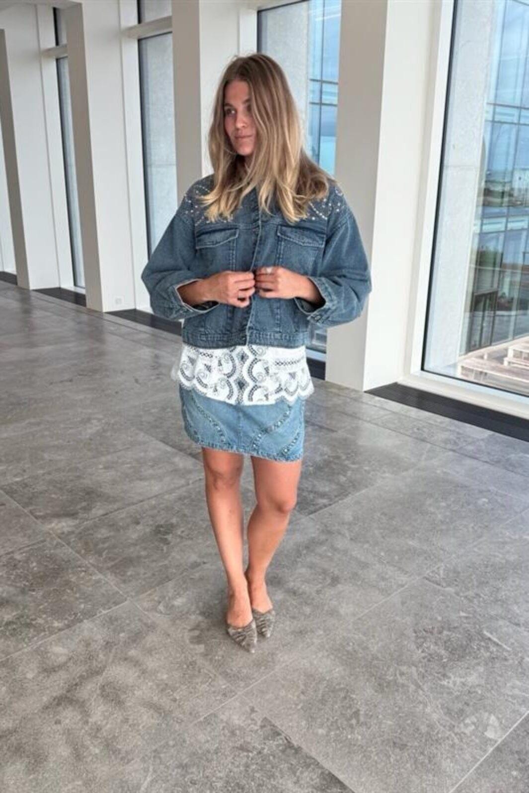 Vaaleansininen farkkutakki Y. A.S:ltä, jossa on brodeerauksia ja helmikoristeita. Takissa on rento malli, kauluspaita ja pitkät hihat. Edessä olevat napit ja kaksi rintataskua antavat takille klassisen ilmeen.