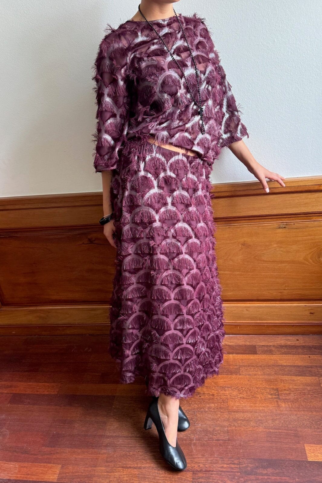 YAS:in hame, joka on valmistettu 100 % polyesterista syvässä burgundinpunaisessa sävyssä, jossa on metallinen printti ja fransseja koko pinnalla.