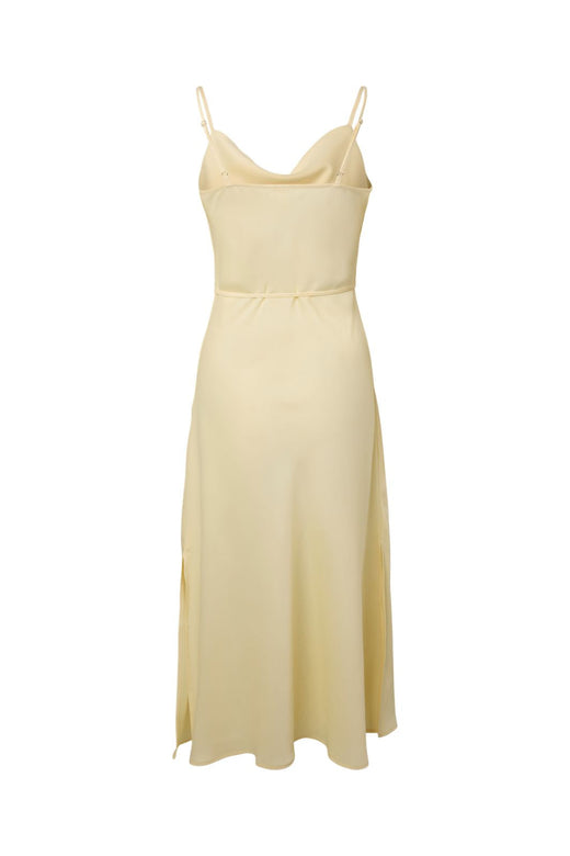 Pitkä mekko YASilta vaaleissa keltaisen ja kerman sävyissä. Mekossa on ohuet olkaimet ja drapeerattu cowl-pääntie sekä vyötäröllä solmittava nauha.
